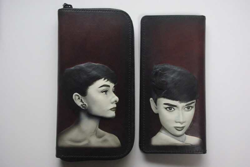 牛ヌメ革をもり上げてエアーブラシと筆を使って着色しております。