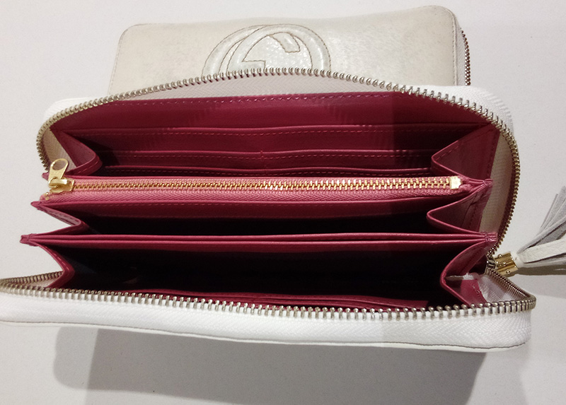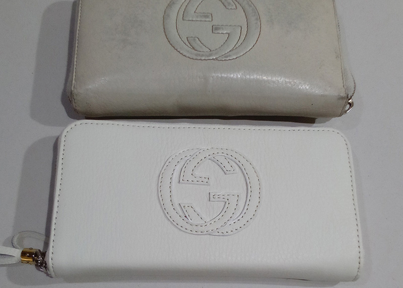 長年使って気に入っていた財布が汚れやくたびれてしまった。また同じ財布が欲しいとの事で注文頂きました。但しGマークはお客様の持ち込みで、縫い付け、のみで対応しました。財布内側はピンクで製作。
