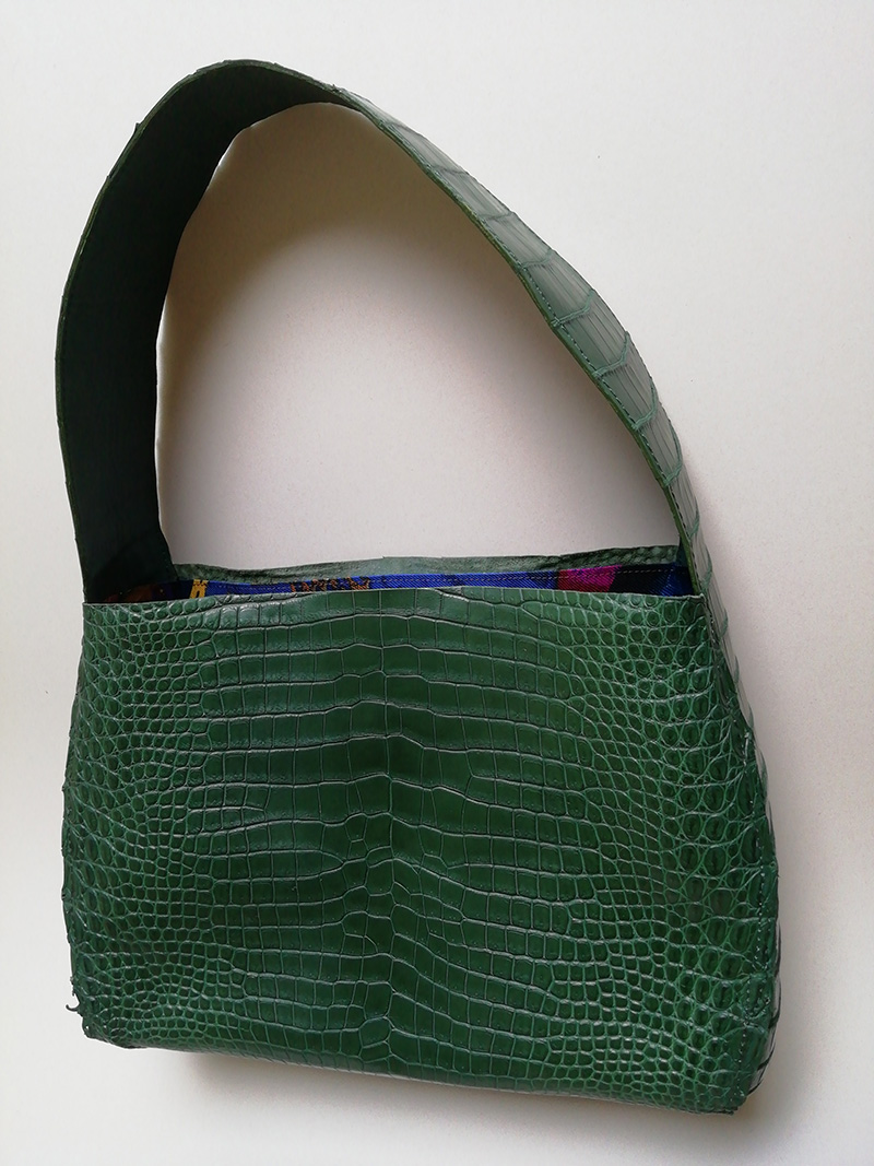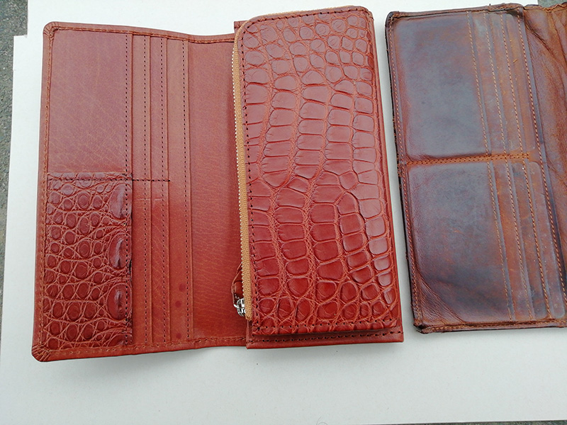 お客様の要望はワニ革のみでの製作で、裏地も付けないと言うオーダーでしたがさすがに強度に不安があるので、薄い芯を入れ柔らかく仕上げました。