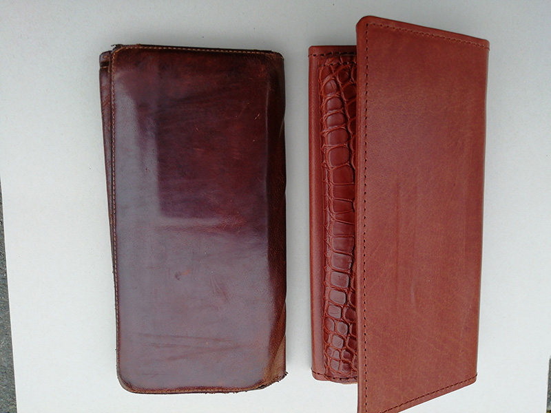 革の質感にこだわりがあって、経年劣化の楽しめる革と言う事で、塗装の無い染料仕上げの革を選びました。コロナ渦で革の残量が足りない為、ワニ革サービスで使用しました。大変喜んでいただきました。