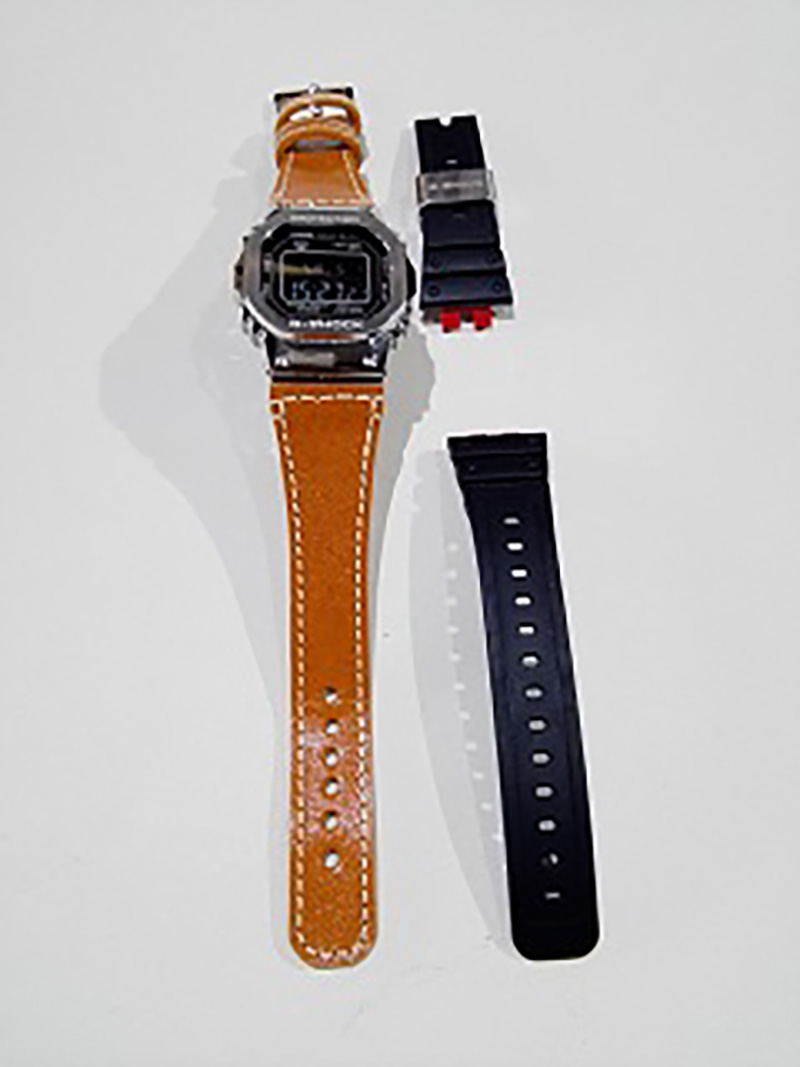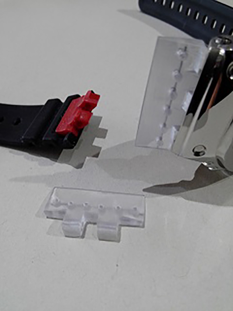 Gショックのベルトを、ゴム製から革にするためにジョイント部分の部品を樹脂にて製作しました。その後、ベルト部分も製作し、2つを合体させました。