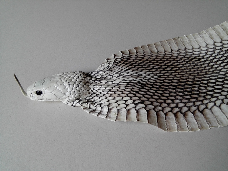 頭付きのコブラの革を仕入れて、頭がしわくちゃに縮んだ状態から、威嚇状態に加工して、ベルトにしました。